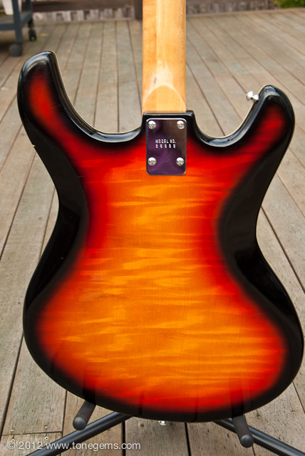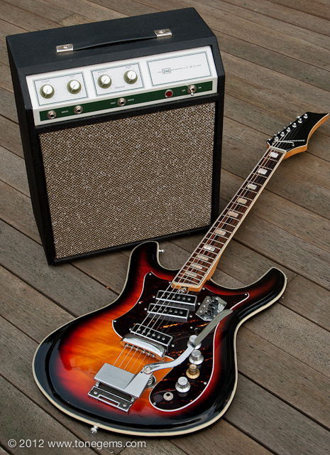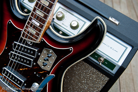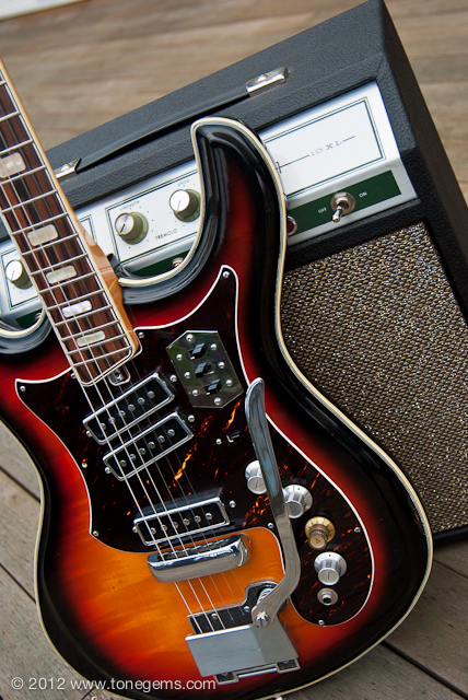 The Silvertone 1445 first appeared in the Sears catalog in 1968, and hung around in a few variations through the early 1970′s. It has three very loud single-coil (“Hound Dog”) pickups wired in series just like the old Danelecto models. The fast, low-profile solid Maple neck with Rosewood fingerboard sports medium to low action and is easy to play. The growling Teisco “Hound Dog” single-coils have lots of bite, and the solid poplar body has plenty of sustain. Of course, the single-coils and non-shielded wiring can be a bit noisy if you’re not careful, but easy to avoid. And I must say that the hand-painted sunburst finish over the flamed Maple; the contoured German carve body with tortoise shell pickguard; and intricate triple-layer celluloid binding makes this guitar a stunning sight to see.
