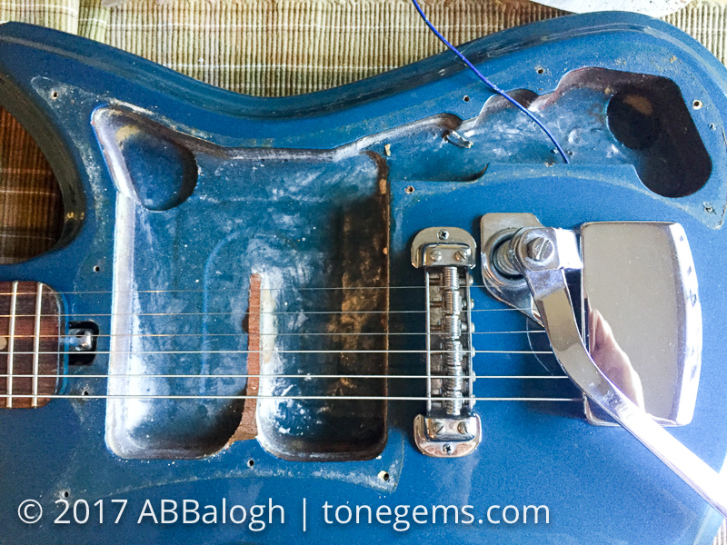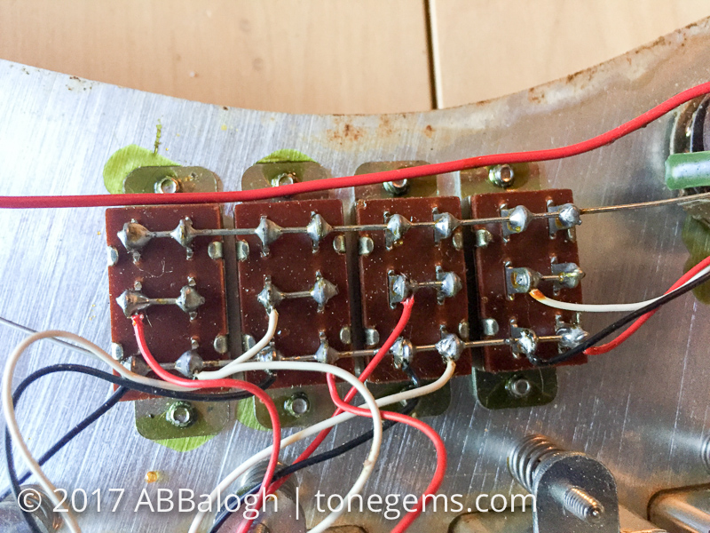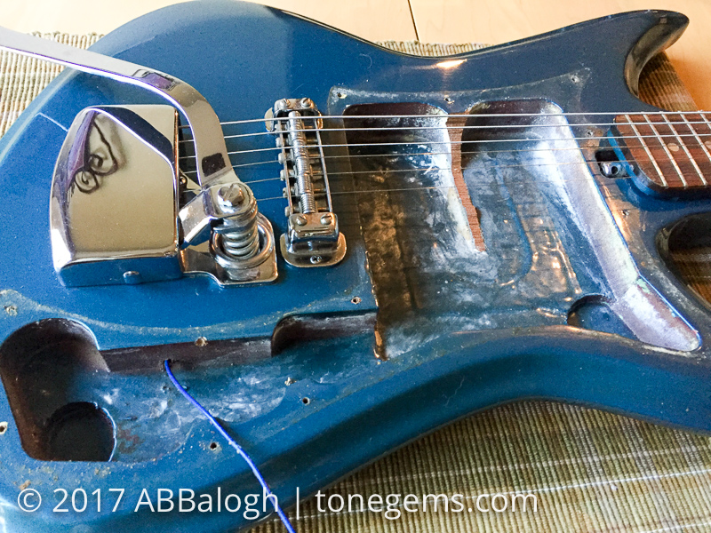 Detailed tear down photos of a 1969 Silvertone 1437 electric guitar, pick guard, pickups and electronics.